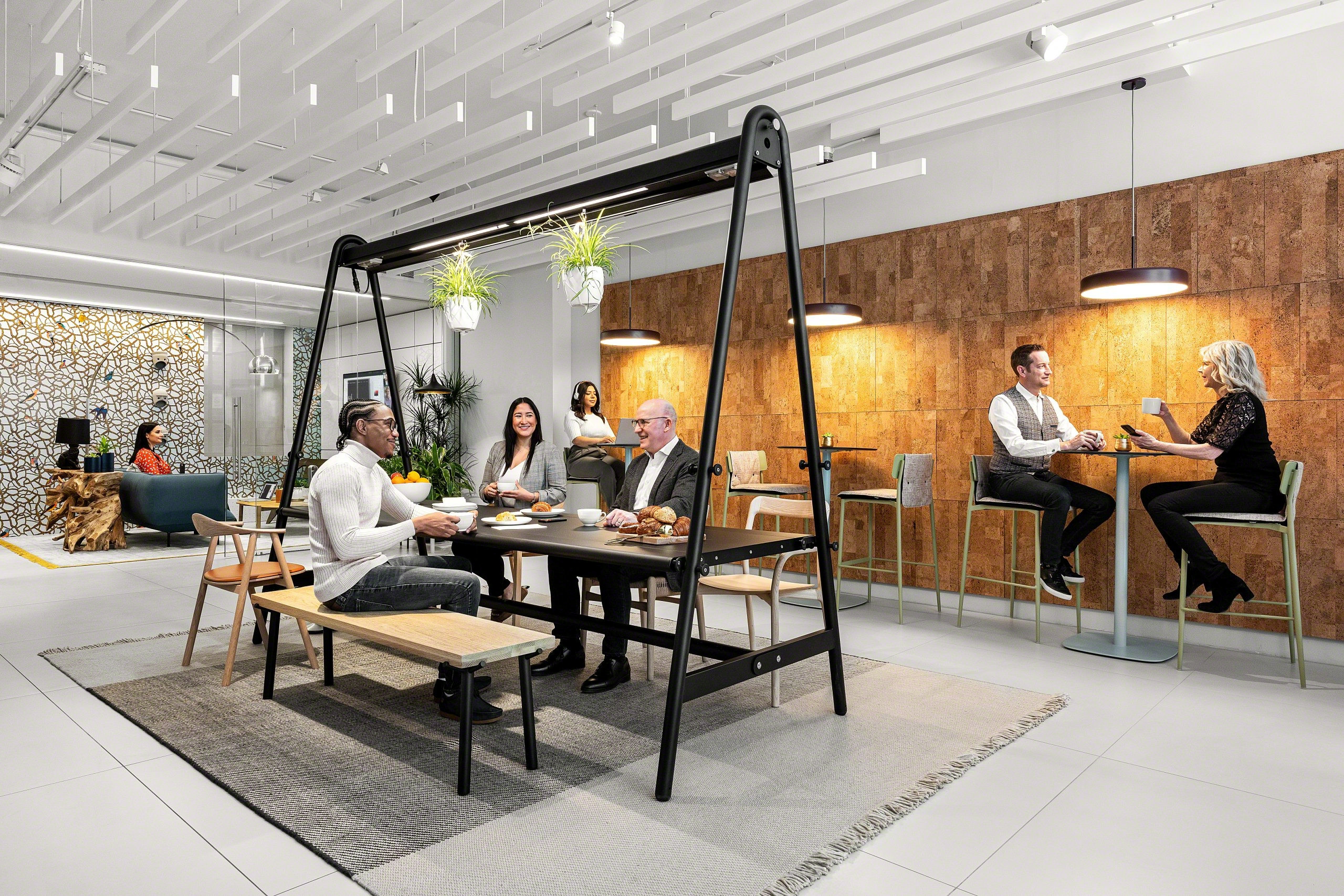 - Biophilic elements — natural light, views to the outside, living materials, and organic form that connect people to the rhythms of the natural world