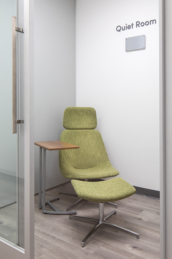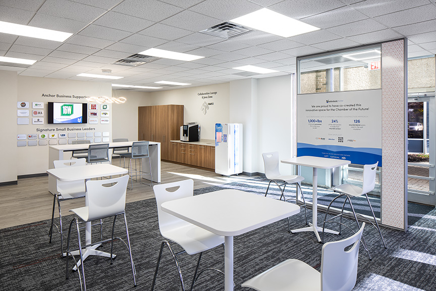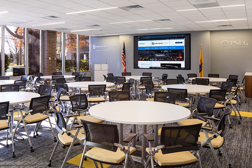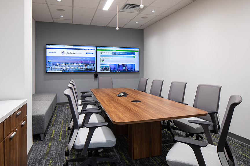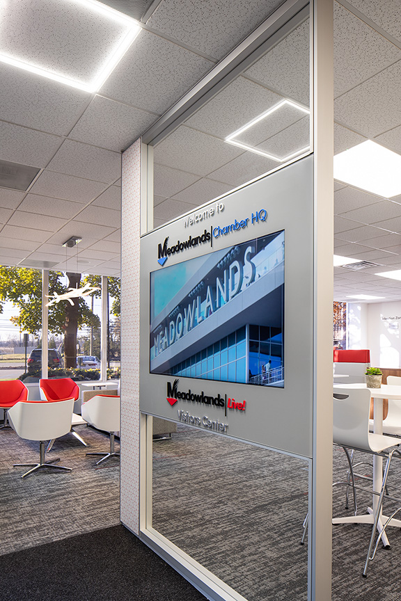 The new home more than doubles their existing space allowing for a modern and efficient office environment for their management team. It also created the first Meadowlands Visitors Center and a dynamic Business Hub open to members every day as part of their membership. The Business Hub is for all members to use as a space to meet with a member, prepare a proposal, present to a client, work on MC committee initiatives or learn.