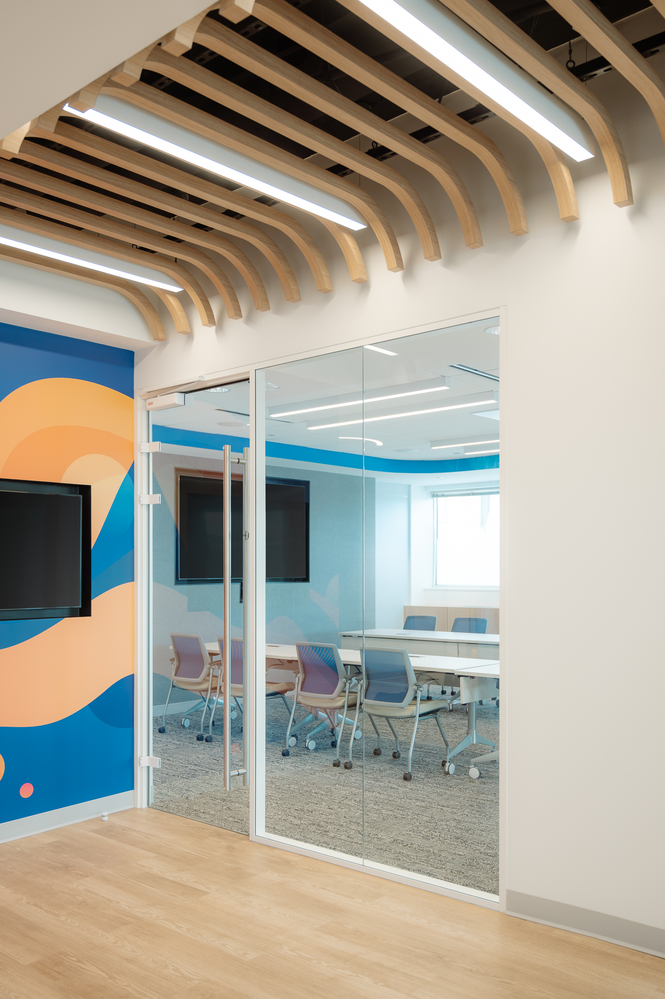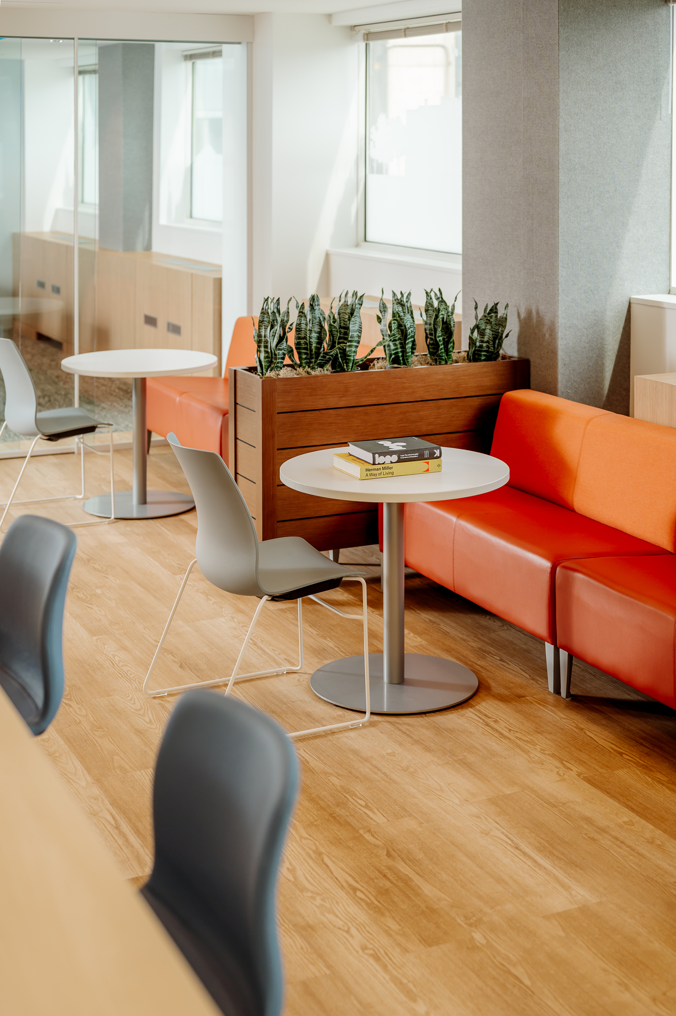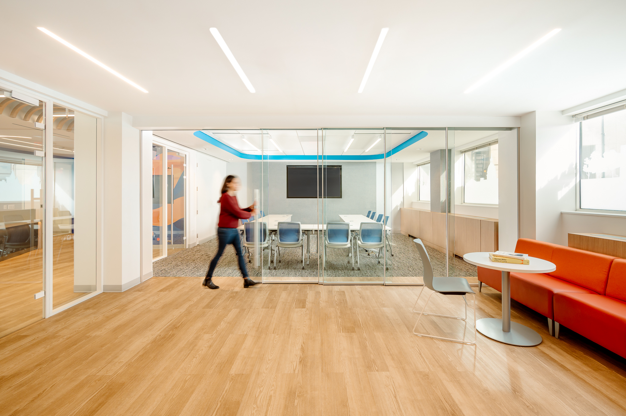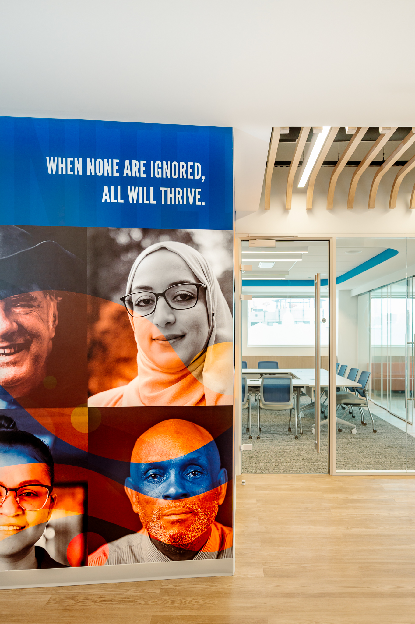 With the desire to develop an open-plan space, sshape designed a space with coworking spaces and workstations with minimal private office areas. This approach supports free communication, activates opportunities for collaboration, and propagates natural light throughout. Solutions that our team provided included demountable glass walls furniture solutions to co-create a space with natural wood tones, breathtaking top-floor views, and vibrant branding to produce a welcoming and impactful environment that both reflects and supports their mission.