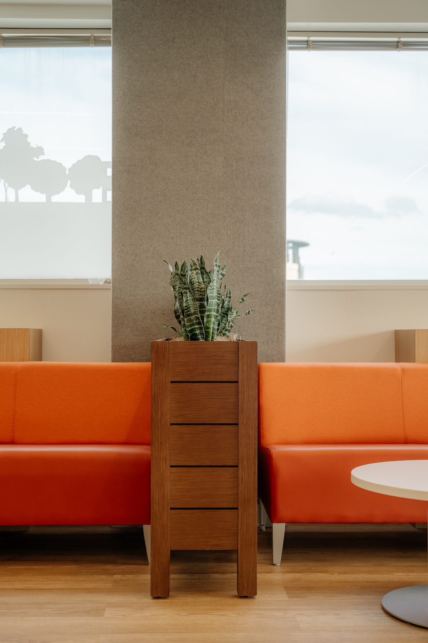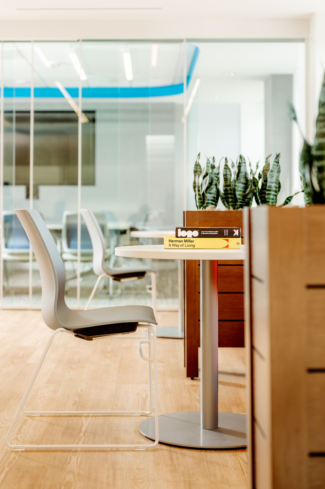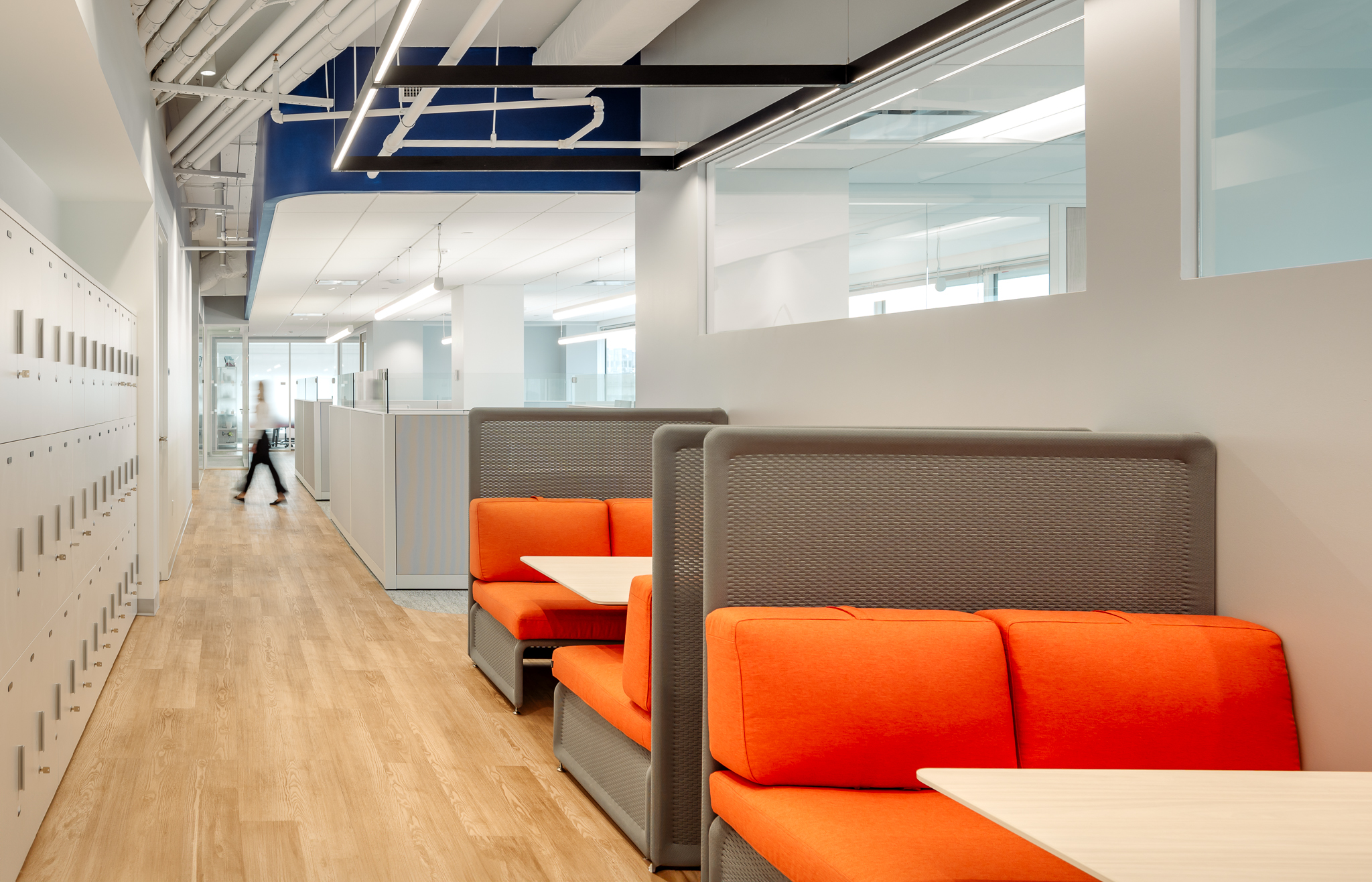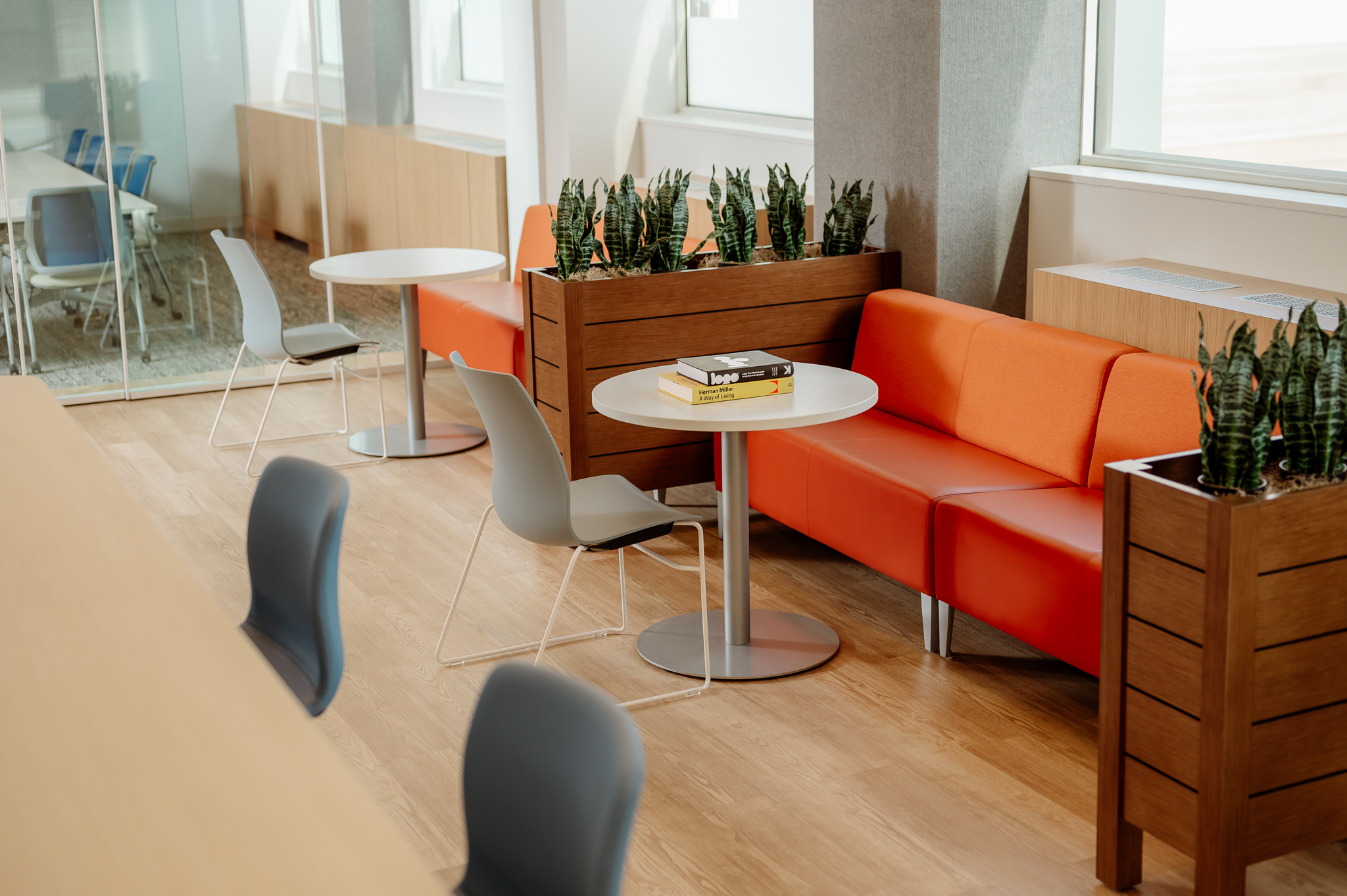 With the desire to develop an open-plan space, sshape designed a space with coworking spaces and workstations with minimal private office areas. This approach supports free communication, activates opportunities for collaboration, and propagates natural light throughout. Solutions that our team provided included demountable glass walls furniture solutions to co-create a space with natural wood tones, breathtaking top-floor views, and vibrant branding to produce a welcoming and impactful environment that both reflects and supports their mission.